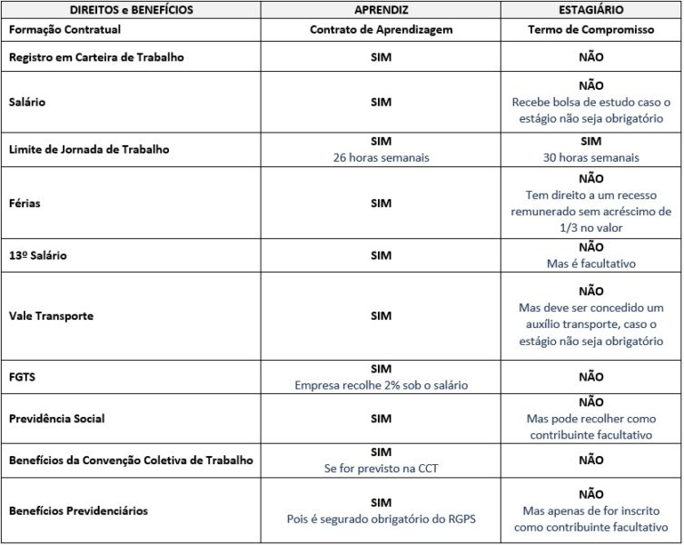 Contudo, para efeitos jurídicos, o jovem aprendiz e o estagiário encontram-se em situações completamente distintas, pois, o primeiro é regulado pela CLT e o segundo pela Lei 11.788/2008. Enquanto o estágio tem o objetivo de preparar o aluno para o mercado de trabalho (sendo uma parte complementar do curso), o aprendiz é o profissional inserido em programa de aprendizagem.